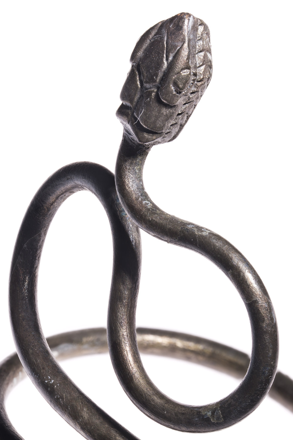 Copper alloy bracelet in form of a snake; formed of a band of copper alloy beaten into a tube, one end of which has been tapered to form the tail, while the other end forms a box-like head with raised eyes and engraved hatching on the underside. The coil is distorted and broken near the middle and towards the tail of the snake.