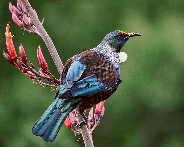 Tui, one of New Zealand’s native honeyeaters are important pollinators of native forest flowers. The flowers of the harakeke, or NZ flax, are perfectly shaped to fit the tui’s beak. The yellow colouring on this tui’s forehead is a dusting of pollen from the harakeke flowers where it had been feeding on nectar.They are intelligent, aggressively territorial, and are said to be able to imitate the calls of nearly every other bird, as well as a vast array of other sounds.