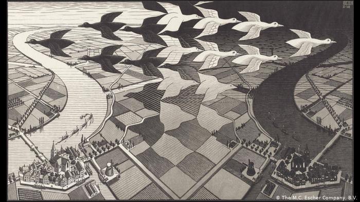I like Escher and Ralph McQuarrie’s Star Wars concept artworks along with the classic artwork Wanderer Above a Foggy Sea (Der Wanderer über dem Nebelmeer) by Caspar David Friedrich