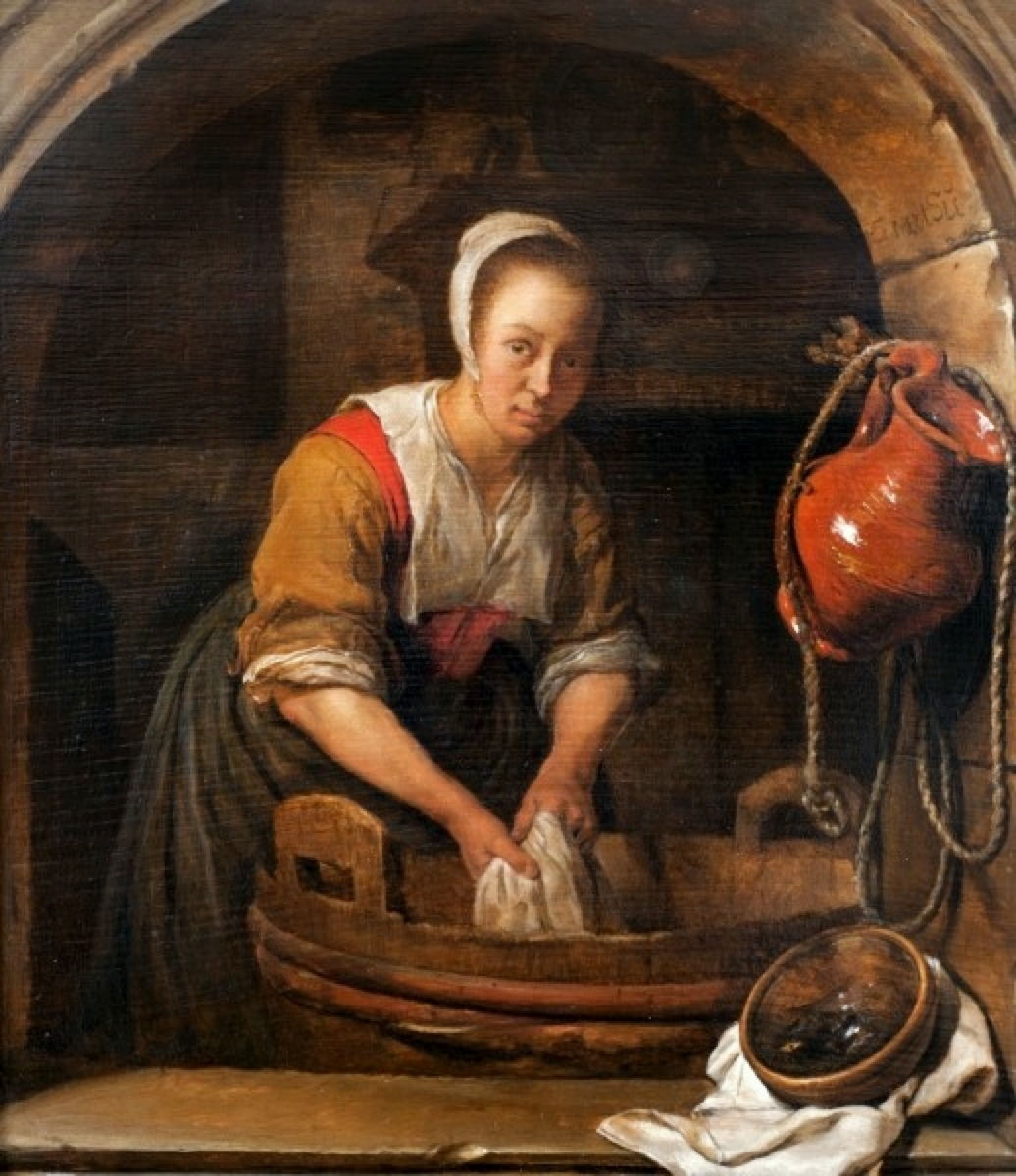 Gabriël Metsu (1629–1667), Washerwoman (c 1650), oil on panel, 23.9 × 21 cm, Muzeum Narodowe w Warszawie, Warsaw, Poland. Wikimedia Commons.