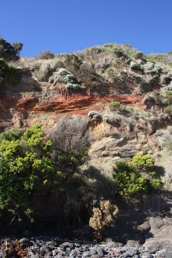 During the Eocene era, the cliffs at West Head show that volcanic lava flowed during periods and hardened to form dark basalt. This is interrupted by a period of no lava flow, when there is plenty of plant fossils found in the strata. This is signified by the thin red layers you can see here.