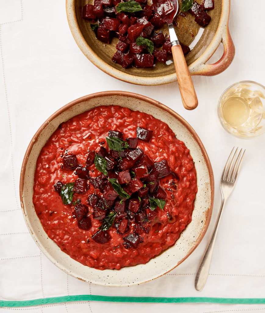 Check the risotto for seasoning, and stir in a little more water to loosen, if need be. Distribute between shallow bowls and serve with a quarter of the spiced lime beetroot spooned over each portion.