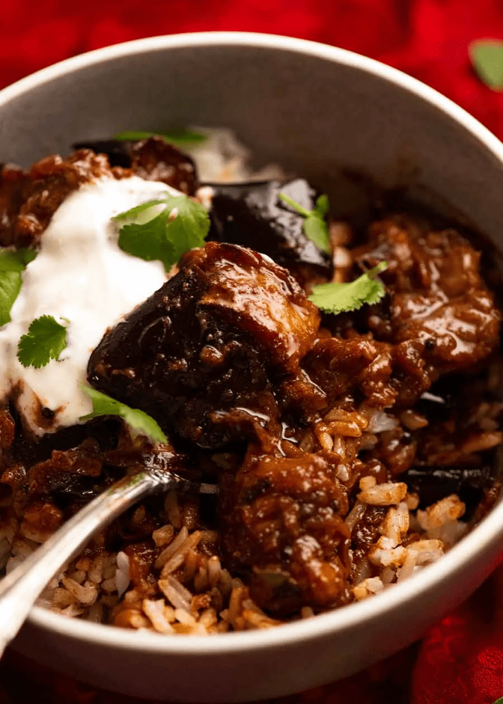 • Your result should be a very thick, juicy, strongly flavoured curry with eggplant partially intact but half collapsed.
