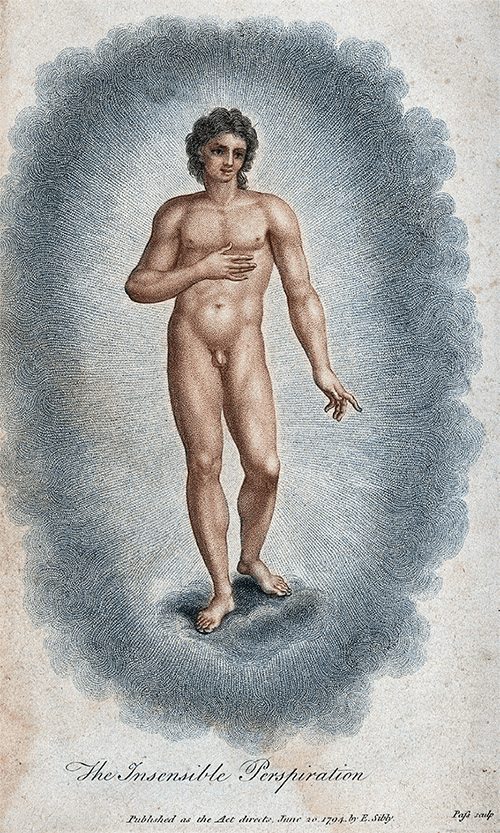 When applied to the living body, as Marques does in his own illustration, the word aura seems to designate a nearly imperceptible boundary that extends beyond while also hovering around the physical body. In “The Book of Skin,” Steven Connor offers a more recent definition of the aura as an ethereal exoskeleton: a second skin that, like a shadow, is “conceived not as a separate entity that is capable of existence apart from the body.” At once liminal and permeable, forever forming and re-forming itself, this gentle breeze entangles bodily interiors and exteriors within a unity that cannot be dissected or divided any more than one can cut air with a knife.