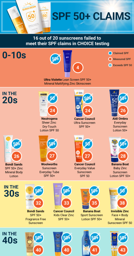 16 out of 20 sunscreens fail to meet their lofty claims of being 50+ SPF. Sunscreens are an essential if you live in Australia or New Zealand as the UV here is diabolical and skin cancer is very common, even for people with olive skin. See full infographic. The study was conducted by the Therapeutic Goods Ad