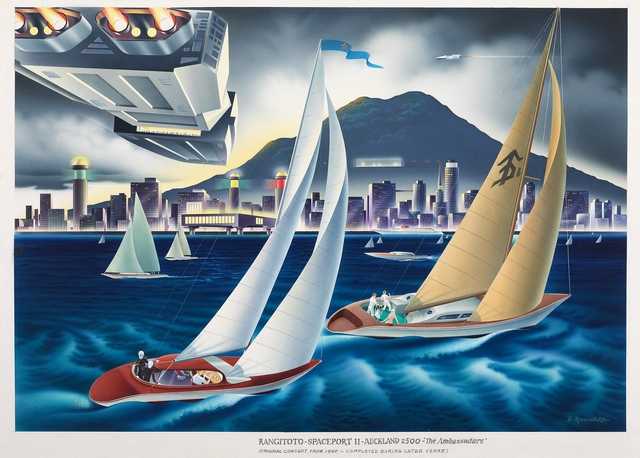 Bernard Roundhill. ‘Rangitoto Spaceport II – Auckland 2050 – “The Ambassadors”‘, 1960. Airbrushed ink and gouache with added brushwork on card.