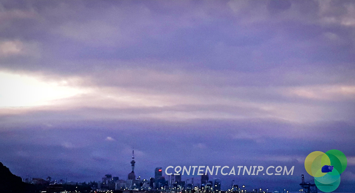 Night was falling quickly and the clouds were a deep purple and blue. As dusk descended, a violent wind picked up over Auckland city bringing a huge tropical storm and a deluge as I walked home.