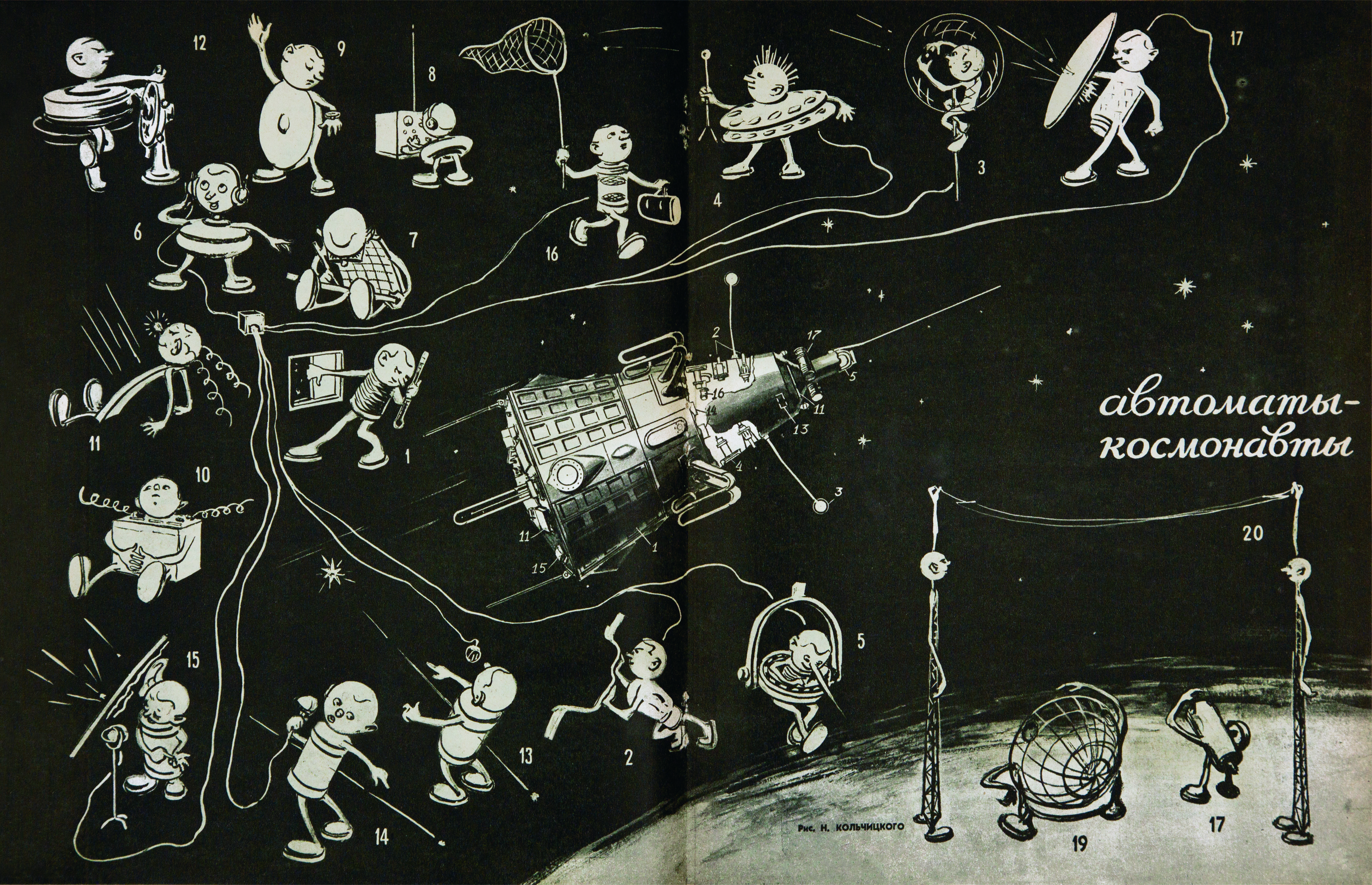 Previous Image Next Image technology-for-the-youth-issue-8-1958-machinese28094astronauts-illustration-by-n.-kolchitsky-showing-the-individual-components-of-sputnik-3-as-different-characters.-picture-credit-the-mo